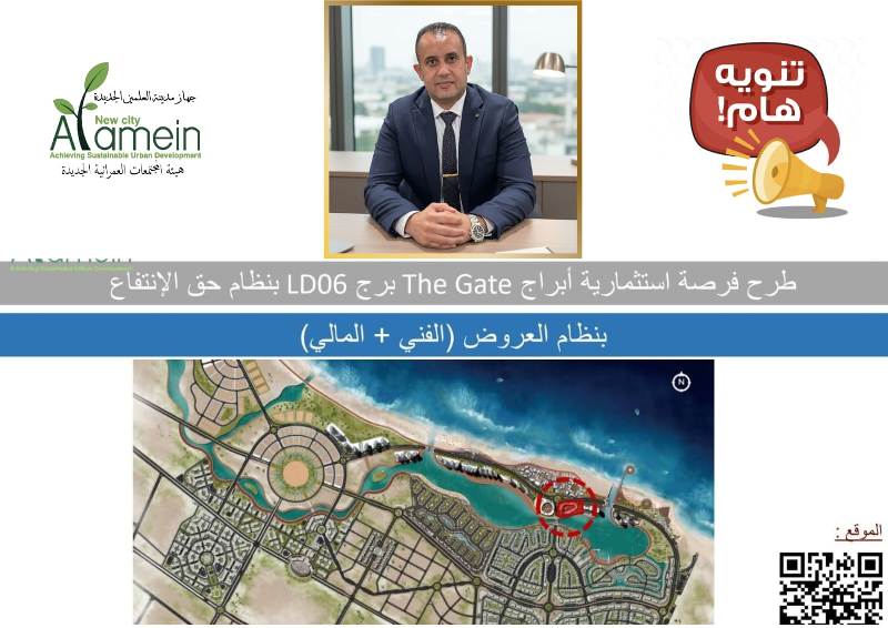 "رئيس جهاز العلمين الجديدة يعلن عن طرح فرصة استثمارية فريدة لإقامة أول مطعم بانورامي بأعلى نقطة علي ساحل البحر المتوسط"