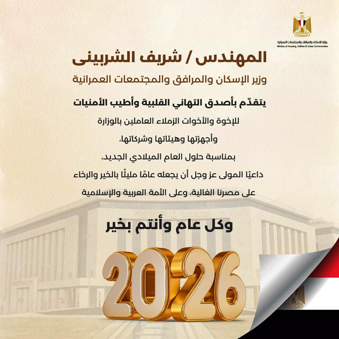 يهنئ السيد شريف الشربينى وزير الإسكان و المرافق و المجتمعات العمرانية السادة العاملين بالوزارة بالعام الميلادى الجديد