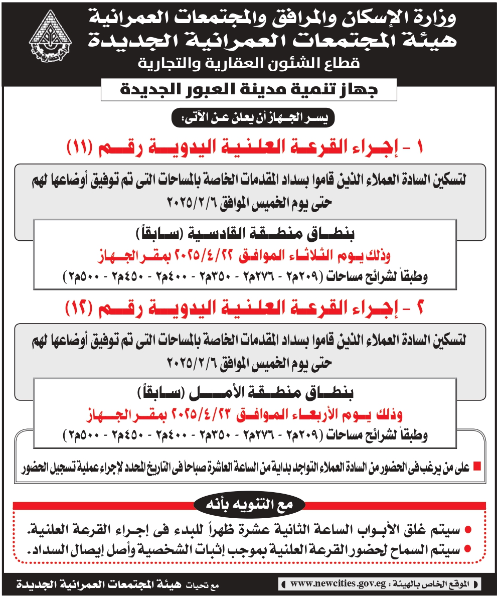 اعلان من جهاز تنمية مدينة العبور الجديدة بموعد اجراء القرعة العلنية اليدوية رقمي 11 و 12