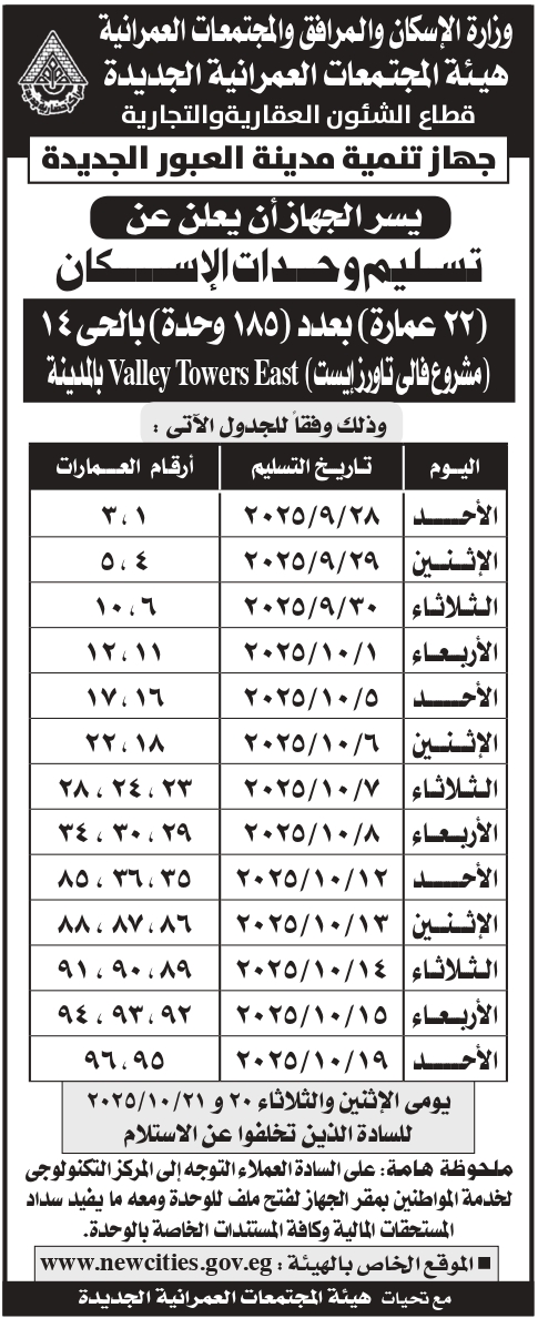 الاعلان عن تسليم وحدات الاسكان عدد 22 عمارة 185 وحدة بالحى ال 14 بمشروع فالى تاورزايست طبقا للمنشور بالإعلان التالى بمدينة العبور الجديدة