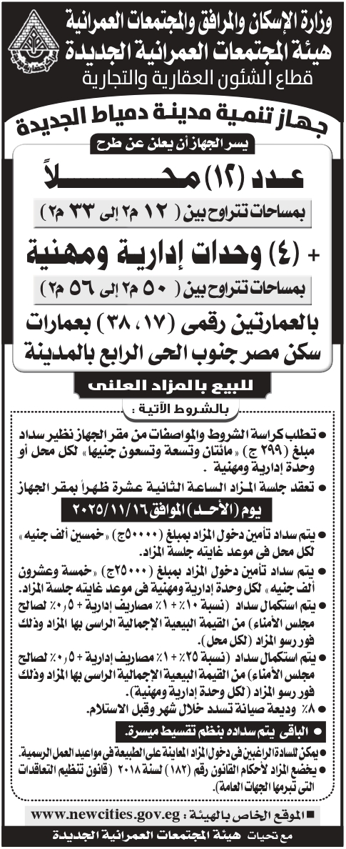 طرح عدد (12) محلا تجاريا + (4) وحدات إدارية ومهنية بالمزاد العلنى طبقا للمنشور بالإعلان التالى بمدينة دمياط