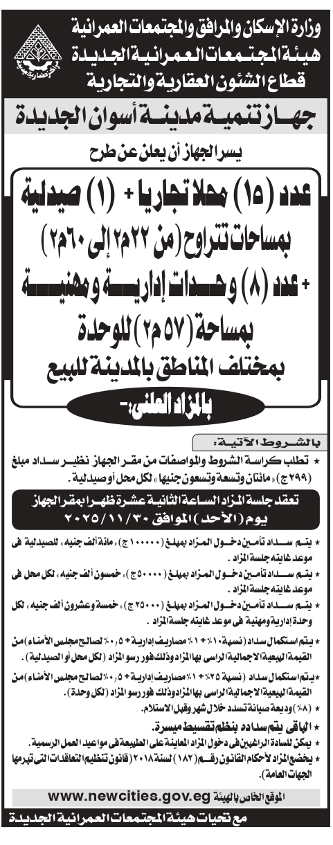 طرح عدد (15) محل تجارى + (1) صيدلية + (8) وحدات إدارية ومهنية مساحات مختلفة بالمناطق المختلفة للبيع بالمزاد العلنى طبقا للمنشور بالإعلان التالى بمدينة اسوان الجديدة