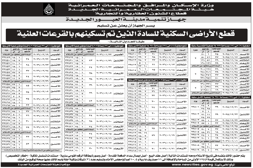 الاعلان عن تسليم قطع الاراضى السكنية للسادة الذين تم تسكينهم بالقرعات العلنية طبقا للمنشور بالإعلان التالى بمدينة العبور الجديدة