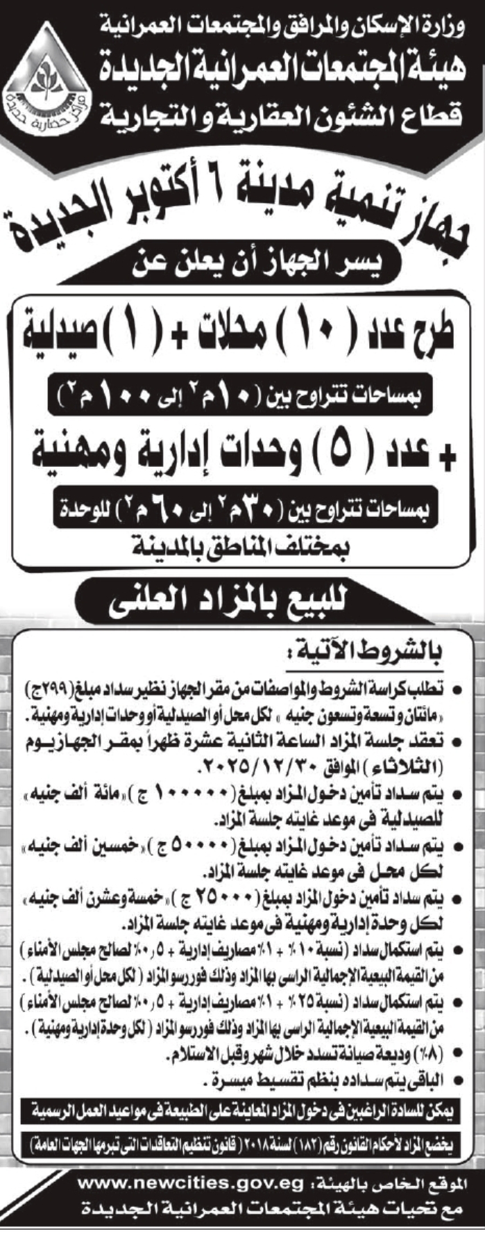 طرح عدد (10) محلات تجارية + (1) صيدلية + (5) وحدات إدارية ومهنية مساحات مختلفة بالمناطق المختلفة للبيع بالمزاد العلنى طبقا للمنشور بالإعلان التالى بمدينة 6اكتوبر