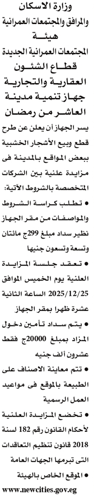 طرح قطع وبيع الأشجار الخشبية ببعض المواقع بمزايدة علنية وطبقا للمنشور بالإعلان التالى بمدينة العاشر من رمضان