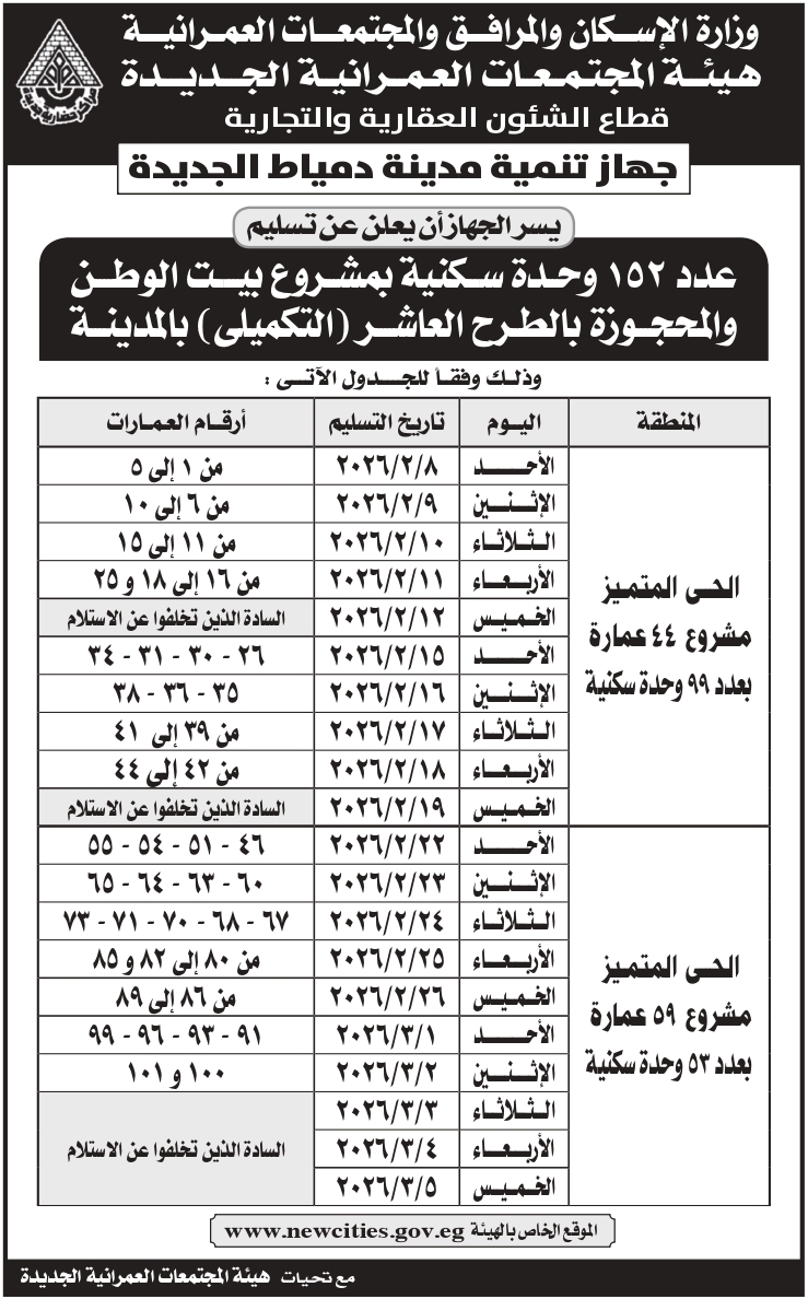 تسليم عدد (152) وحدة سكنية بمشروع بيت الوطن والمحجوزة بالطرح العاشر التكميلي طبقا للمنشور بالإعلان التالى بمدينة دمياط الجديدة
