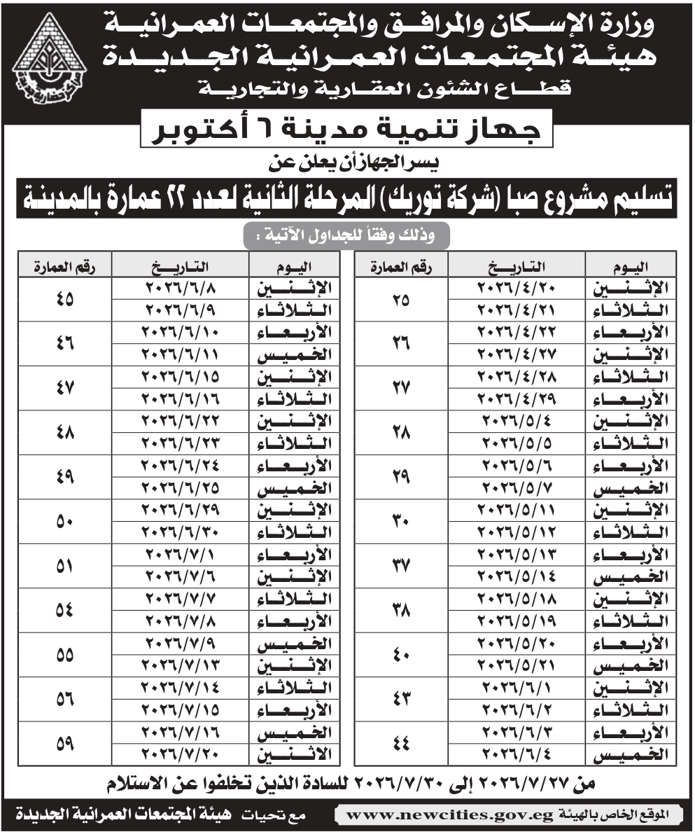 تسليم وحدات مشروع صبا "شركة توريك" (المرحلة الثانية) لعدد (22) عمارة طبقا للمنشور بالإعلان التالى بمدينة 6 أكتوبر