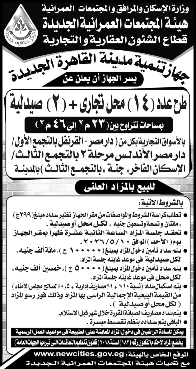 طرح عدد (14) محل تجارى + (2) صيدلية بمساحات مختلفة للبيع بالمزاد العلنى طبقا للمنشور بالإعلان التالى بمدينة القاهرة الجديدة