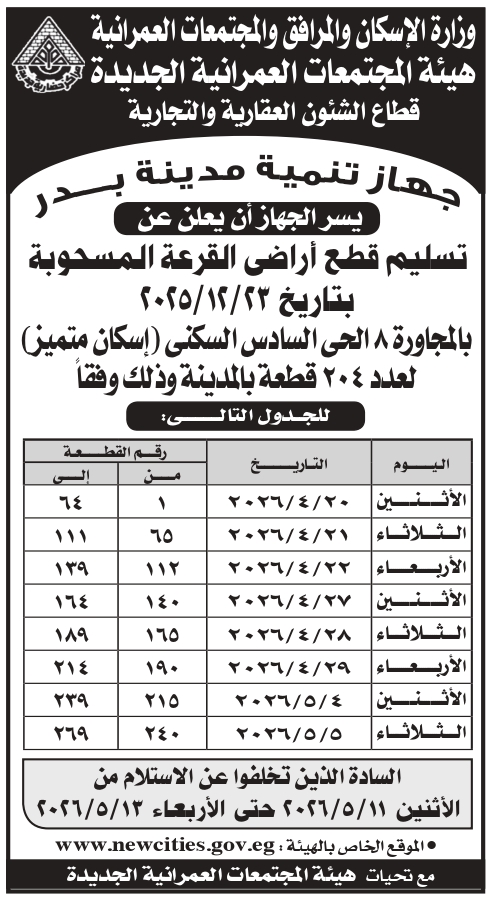 تسليم عدد (204) قطعة أرض (إسكان متميز) بالقرعة المسحوبة بتاريخ 2025/12/23 بالمجاورة 8 الحى السادس السكنى طبقا للمنشور بالإعلان التالى بمدينة بدر