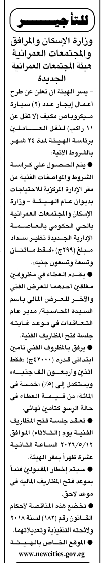 طرح أعمال إيجار عدد (2) سيارة ميكروباص مكيف لنقل العاملين برئاسة الهيئة لمدة 24 شهر طبقا للمنشور بالإعلان التالى