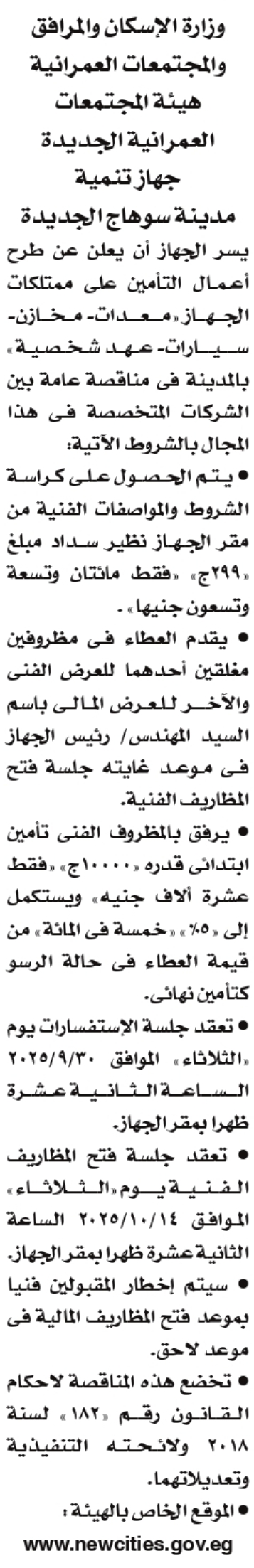 طرح اعمال التأمين على ممتلكات الجهاز من العهد الشخصية . السيارات. المعدات . المخازن سيارات طبقا للمنشور بالإعلان التالى بجهاز مدينة سوهاج الجديدة