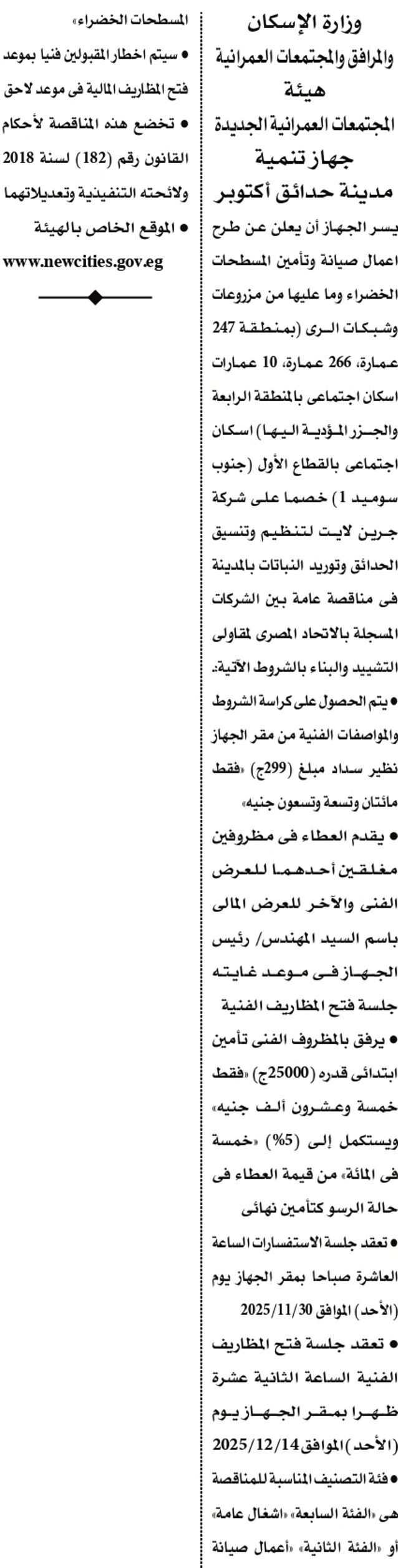 طرح أعمال صيانة وتامين المسطحات الخضراء بما عليها من مزروعات وشبكات الرى طبقا للمنشوربالإعلان التالى بمدينة حدائق اكتوبر