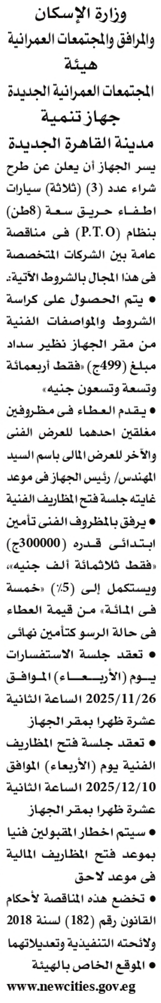 طرح اعمال شراء عدد (٣) سيارات اطفاء حريق سعة 8طن (بنظام BTO) طبقا للمنشور بالإعلان التالى بجهاز مدينة القاهرة الجديدة