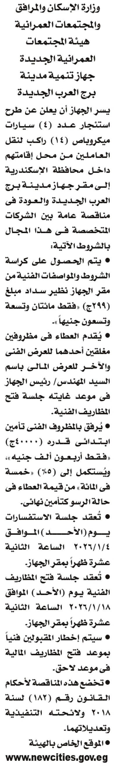 طرح اعمال استئجار عدد (4) سيارة ميكروباص 14 راكب لنقل العاملين من مقر اقامتهم داخل محافظة الاسكندرية الى مقر عملهم بجهاز مدينة برج العرب الجديدة والعوده طبقا للمنشور بالإعلان التالى
