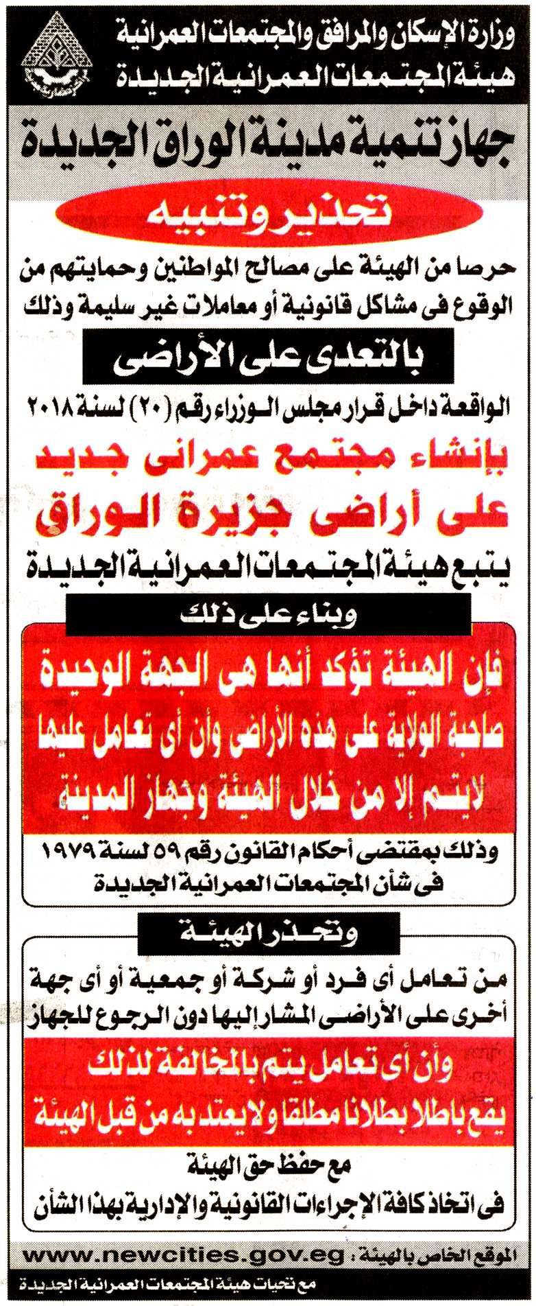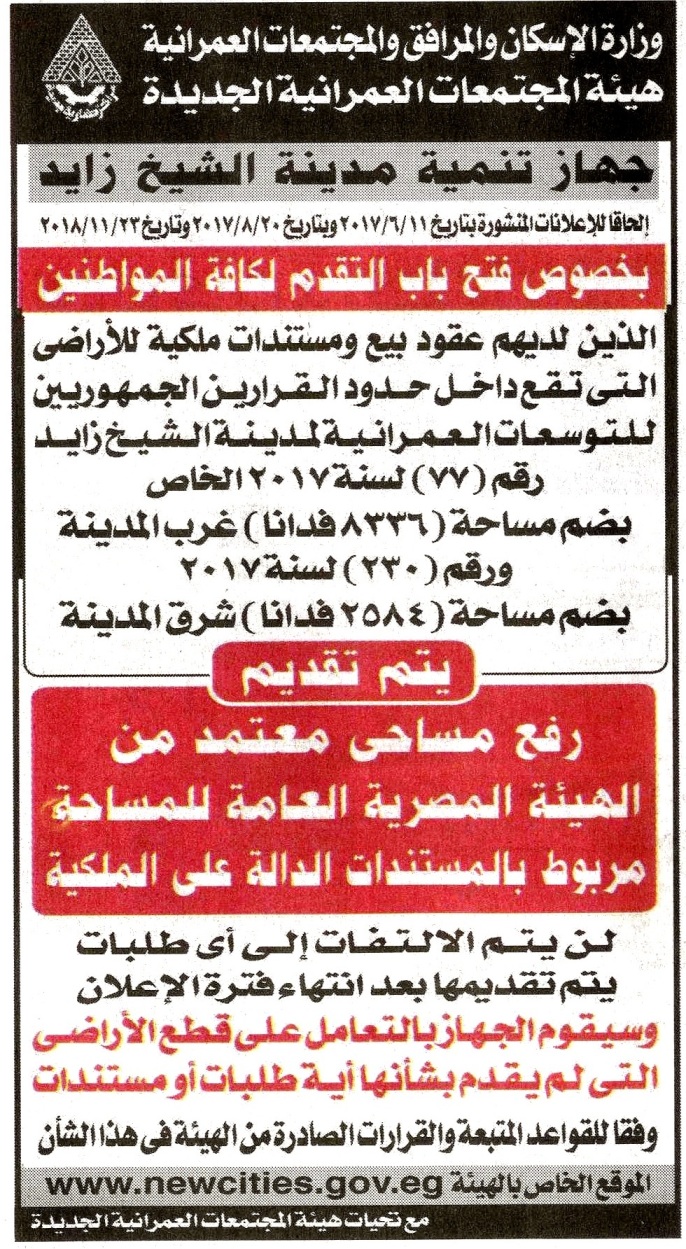 أكدت مصادر بهيئة المجتمعات العمرانية أن الهيئة واجهزتها بالمدن الجديد تعمل على مدار الأسبوع لإصدار اذون سداد رسوم الفحص لمقدمى طلبات تقنين وضع اليد وطالبت المصادر اصحاب الطلبات التى تنطبق عليها الشروط والمقدمة قبل نهاية المهلة بالإسراع بسداد رسوم الفحص قبل 27 سبتمبر الجارى "الخميس القادم" لأنه بعد نهاية المهلة سيتم التعامل مع الطلبات التى لم تسدد عنها الرسوم بإعتبارها غير جادة وسيتم إدراجها ضمن موجات الإزالة