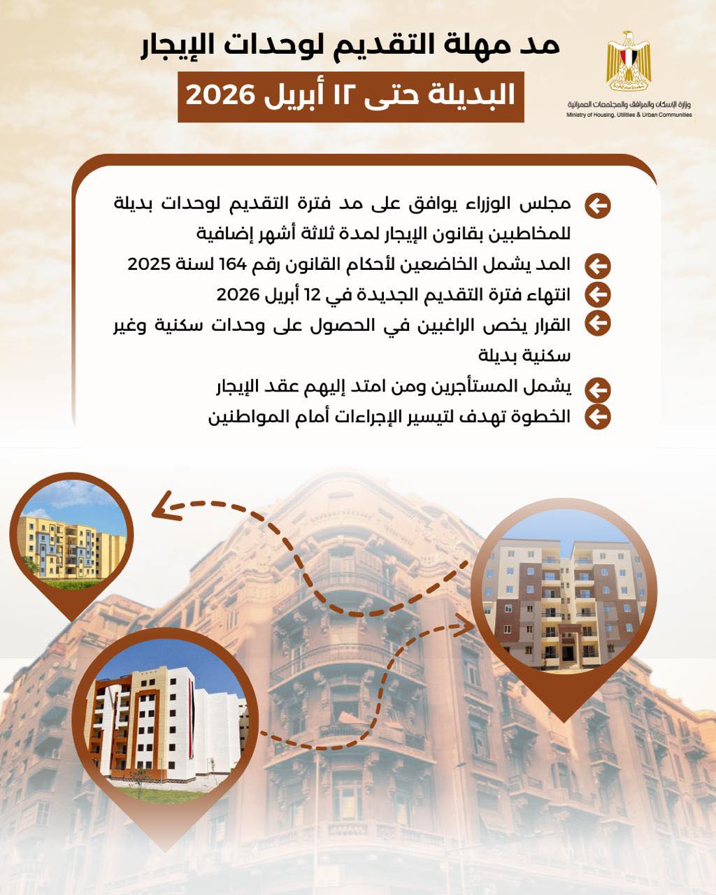 الموافقة علي مد فترة التقديم للحصول علي وحدات بديلة وفقآ لقانون الإيجار القديم، وذلك لمدة ٣ أشهر أضافية.