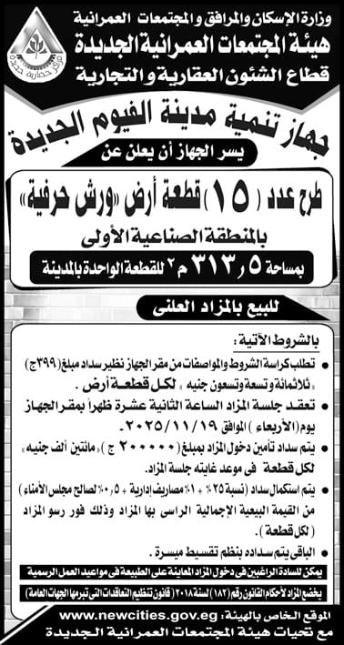 طرح عدد (15) قطعة ارض ورش حرفيه بالمزاد العلنى بالمنطقة الصناعية الاولى طبقا للمنشور بالإعلان التالى بمدينة الفيوم الجديدة