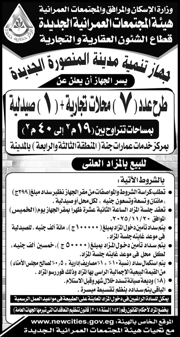 طرح عدد (7) محلات تجارية + (1) صيدلية بمساحات مختلفة للبيع بالمزاد العلنى طبقا للمنشور بالإعلان التالى بمدينة المنصورة الجديدة