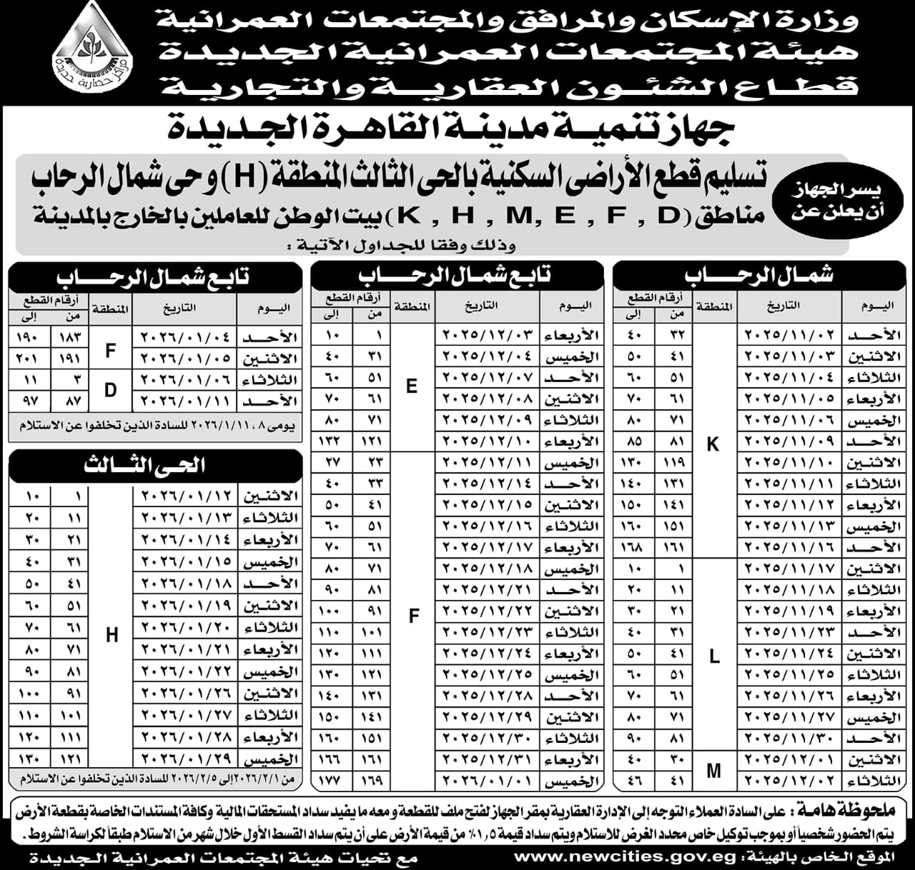 الاعلان عن تسليم الاراضى السكنية لمشروع بيت الوطن للعاملين بالخارج طبقا للمنشور بالإعلان التالى بمدينة القاهرة الجديدة