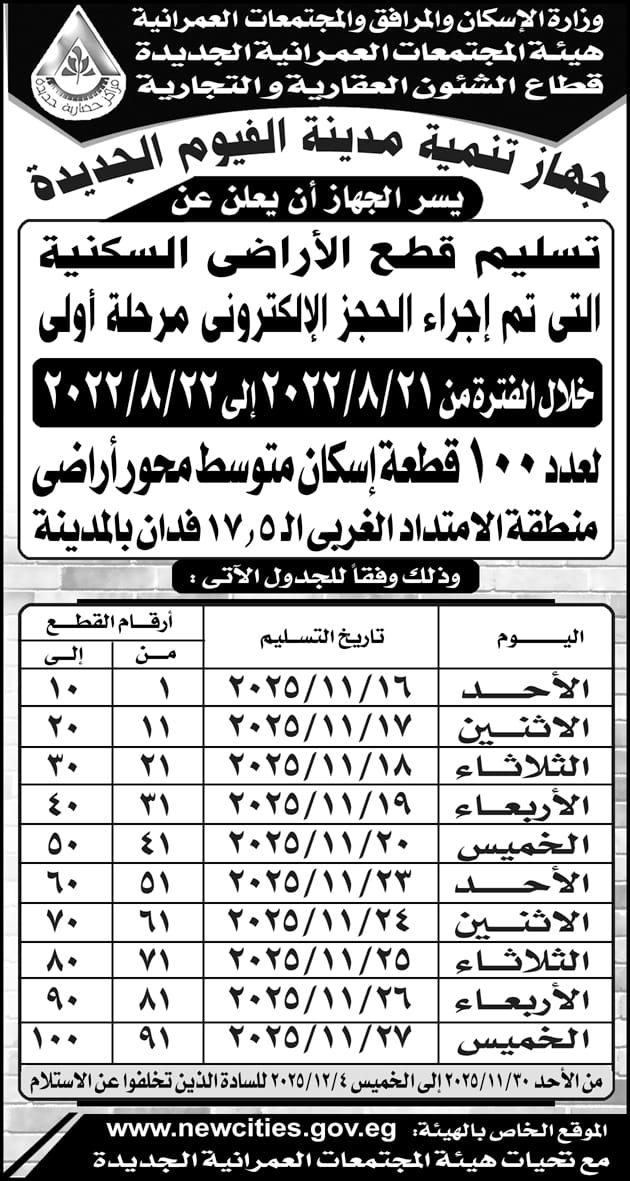 الاعلان عن تسليم قطع الاراضى السكنية طبقا للمنشور بالإعلان التالى بمدينة الفيوم الجديدة