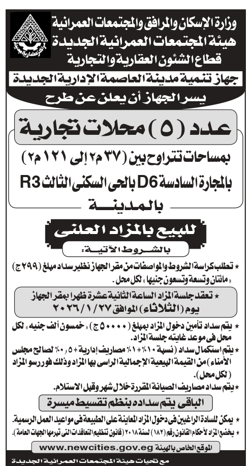 طرح عدد (5) محلات تجارية بالمجاورة السادسة D6 بالحى السكنى الثالث R3 للبيع بالمزاد العلنى طبقا للمنشور بالإعلان التالى بمدينة العاصمة الادارية الجديدة