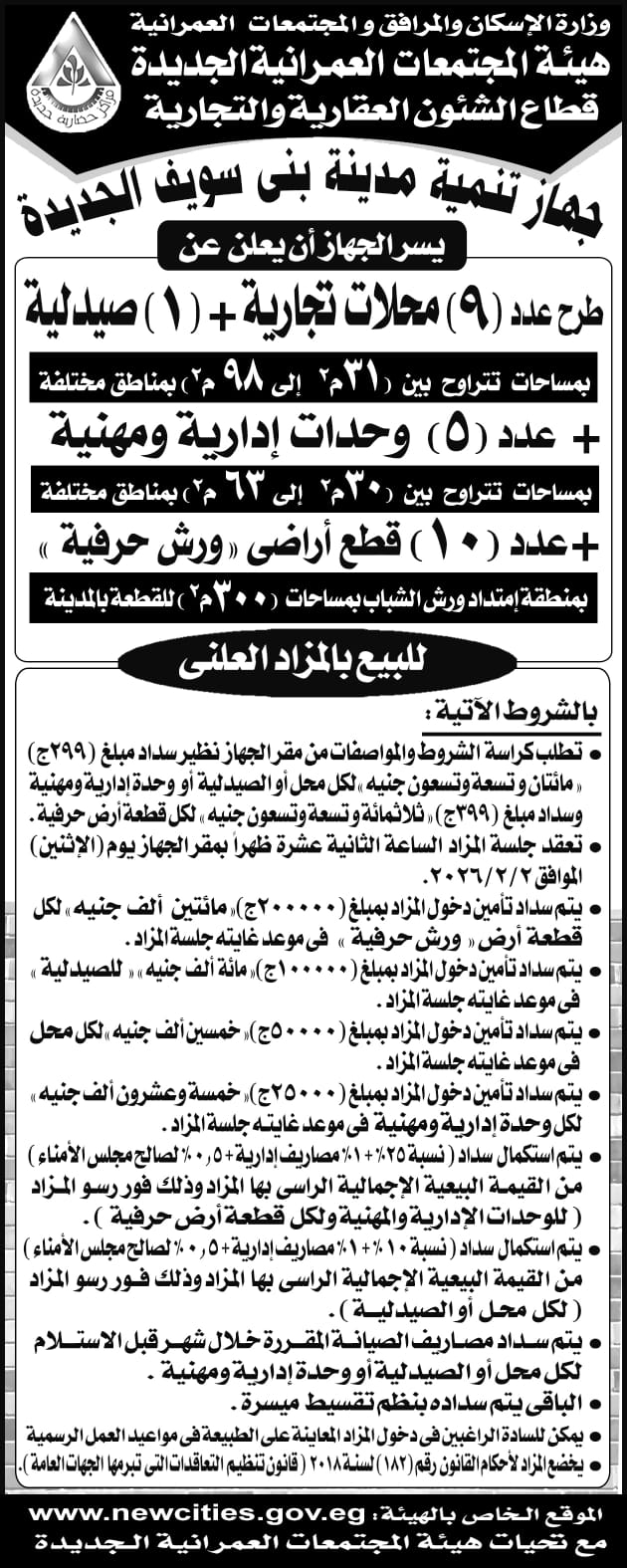طرح عدد (9) محلات تجارية + (1) صيدلية + (5) وحدات إدارية ومهنية + (10) قطع اراضى بنشاط ورش خدمية بمساحات ومناطق مختلفة للبيع بالمزاد العلنى طبقا للمنشور بالإعلان التالى بمدينة بنى سويف الجديدة
