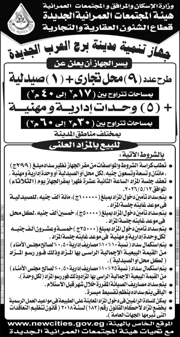 طرح عدد (9) محل تجاري + (1) صيدلية + (5) وحدات إدارية ومهنية بمساحات مختلفة بمختلف مناطق المدينة للبيع بالمزاد العلنى طبقا للمنشور بالإعلان التالى بمدينة برج العرب الجديدة