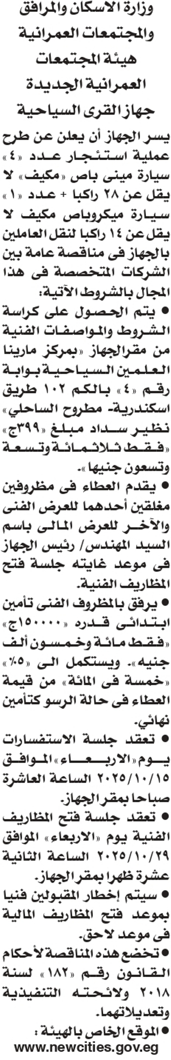 طرح اعمال استئجار (4) سيارات طبقا للمنشور بالإعلان التالى بجهاز القرى السياحية