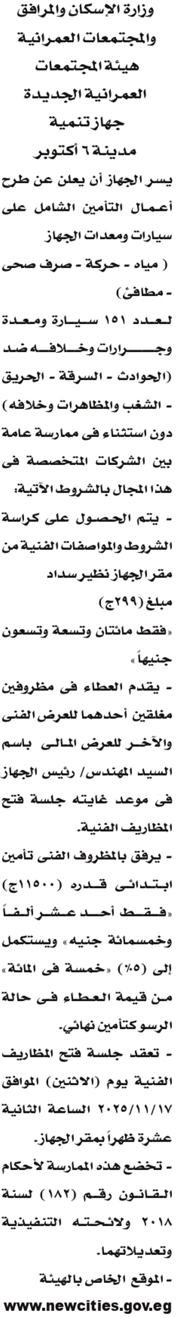 طرح اعمال التأمين الشامل على معدات وسيارات جهاز مدينة 6اكتوبر طبقا للمنشور بالإعلان التالى