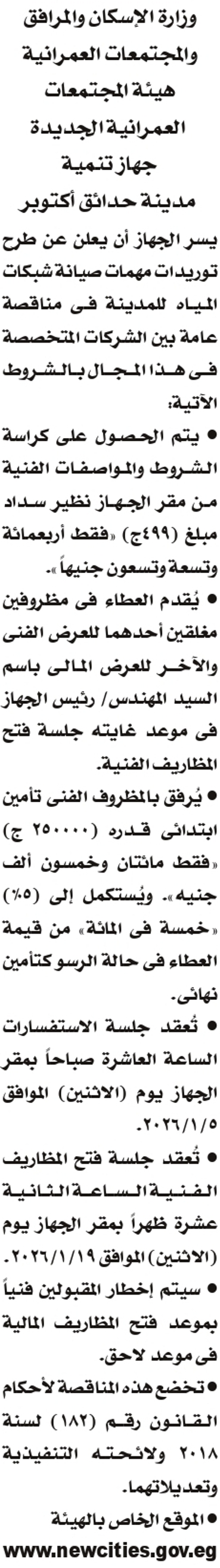 طرح أعمال توريدات مهامات صيانة شبكات المياه طبقا للمنشوربالإعلان التالى بمدينة حدائق اكتوبر